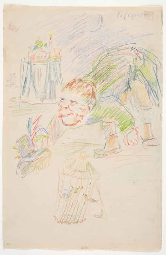 So schuf Max Slevogt mit tiefer Verehrung für Mozart seine meisterhaften Illustrationen zur Zauberflöte. Auch Oskar Kokoschka setzte sich intensiv mit der Oper auseinander: Für die Salzburger Festspiele entwarf er farbgewaltige Bühnenvisionen und expressive Kostüme. Mit einer Vorliebe für farbenprächtige Landschaften übernahm Wolfgang Hutter wiederum die bildnerische Gestaltung des Singspiels an der Grazer Oper. Seine Entwürfe entführen die Betrachter:innen in eine Zauberwelt voller exotischer Pflanzen und Wesen.