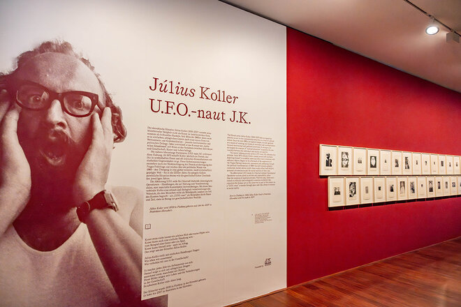 The exhibition gathers central works by Koller from the Generali Foundation Collection—Permanent Loan to the Museum der Moderne Salzburg, including the legendary long-term series U.F.O.-naut J.K. (U.F.O.). Spanning over thirty-five years, the work is composed of one symbolic self-portrait per year.