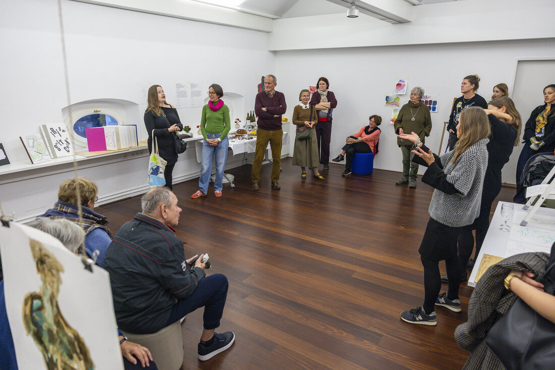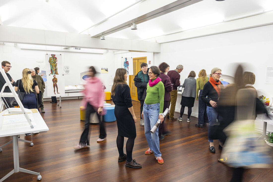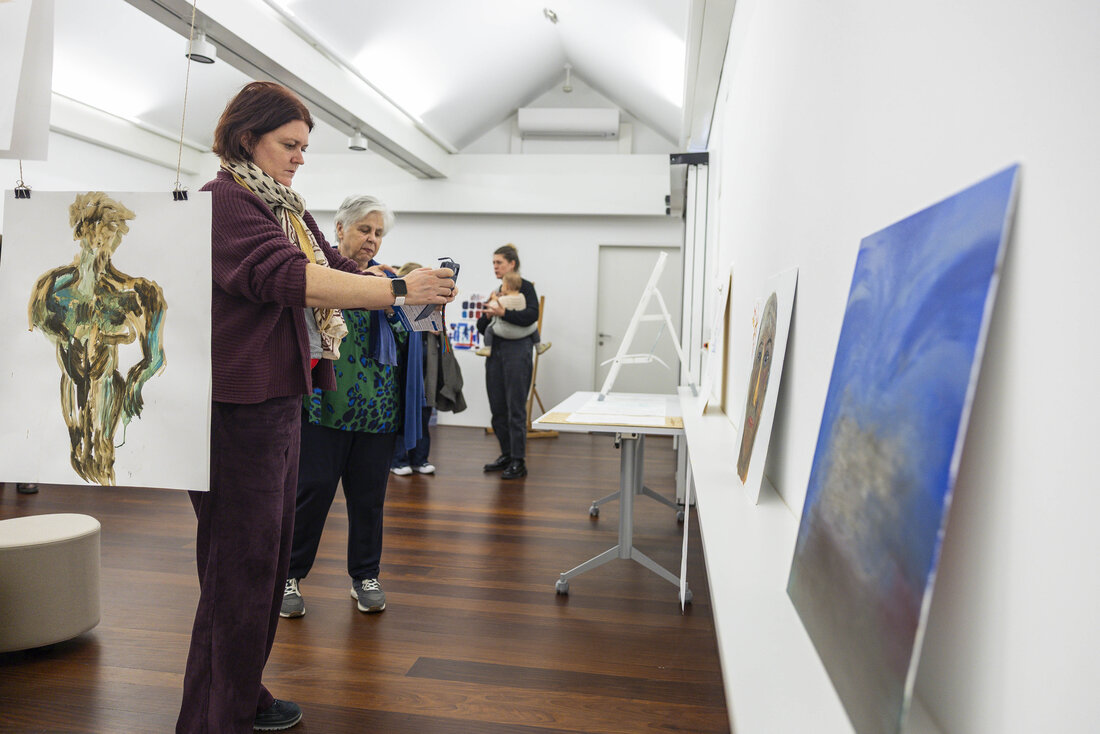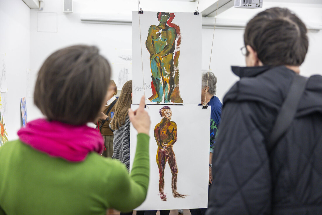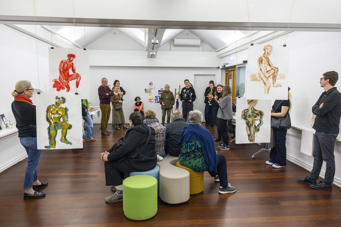 Die beiden Workshop-Formate Friday Sketching und Abendma(h)l im Museum der Moderne Salzburg bieten seit sechs Jahren die Möglichkeit ins kreative Tun einzutauchen. Eine Auswahl an Werken, die in den vergangenen Jahren in den Workshops entstanden sind, wurden vom 7. bis 16. November 2025 im OK-Loft in der Altstadt präsentiert. Unter dem Motto „Gemeinsam Schauen“ wurde die Werkschau in Anwesenheit vieler Workshopteilnehmer:innen und interessierter Gäste eröffnet. Beim gemeinsamen Zurückerinnern an die Entstehungszusammenhänge der Zeichnungen und Malereien wurde die Vielfalt an Themen, Ausstellungen und Zugängen und der experimentelle Charakter der Formate sichtbar. Die Präsentation spiegelte zudem den individuellen Gestaltungsprozess der Teilnehmer:innen zwischen Figuration und Abstraktion wider.